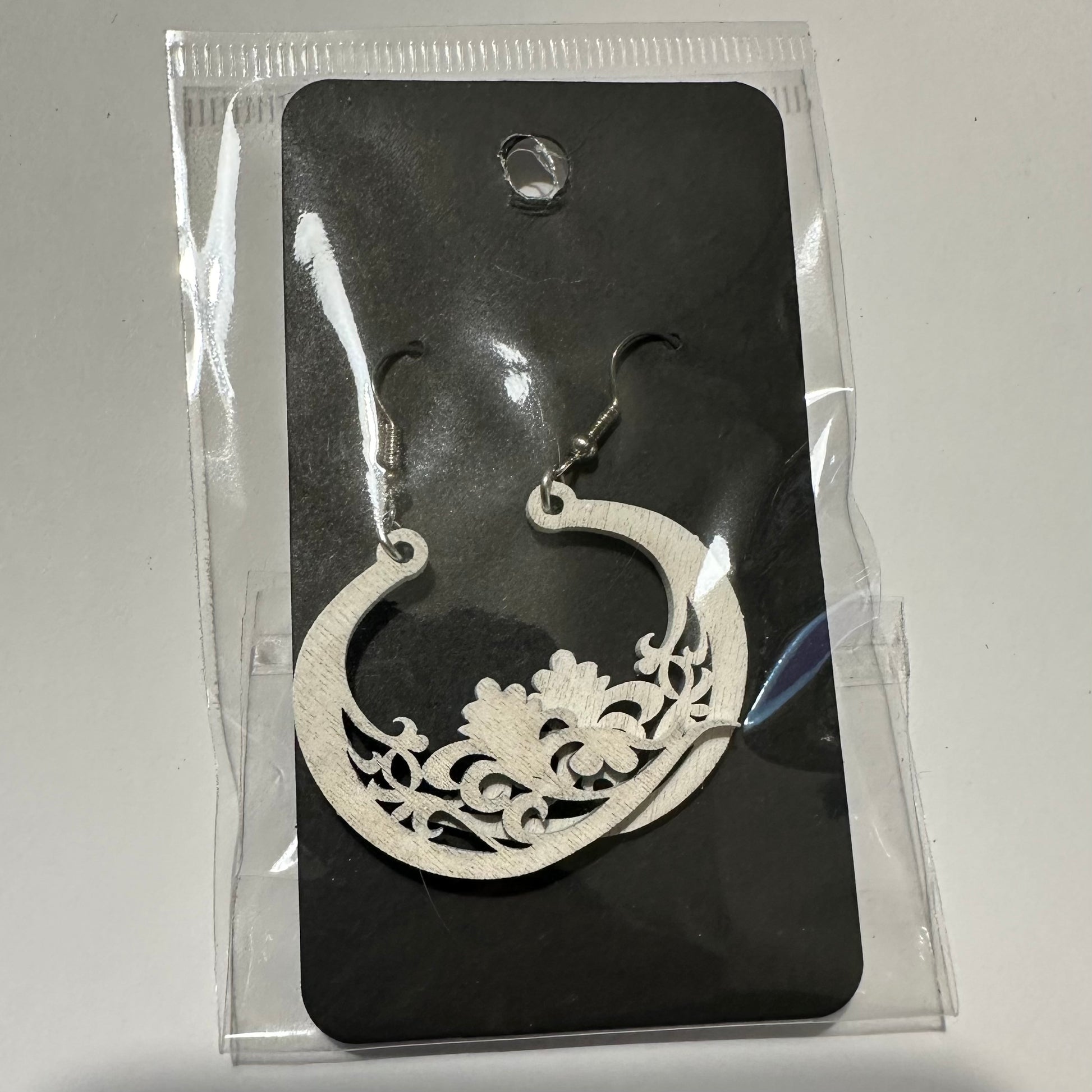 Puiset laserleikatut korvakorut. Koukut allergeeni vapaapa terästä. Korkeus noin 35mm.