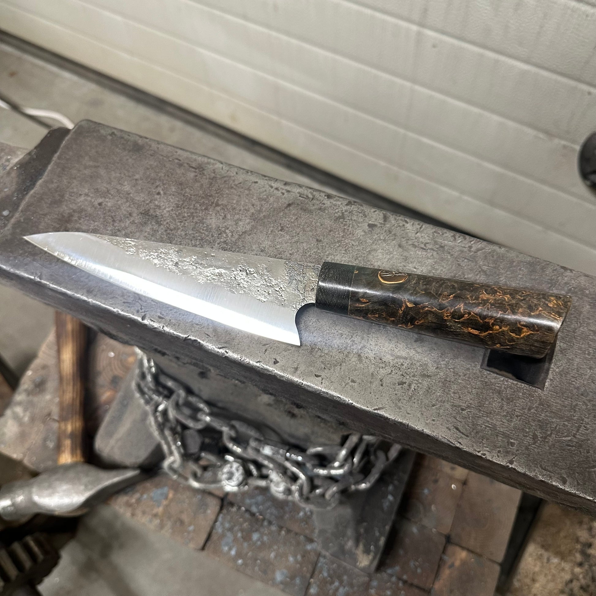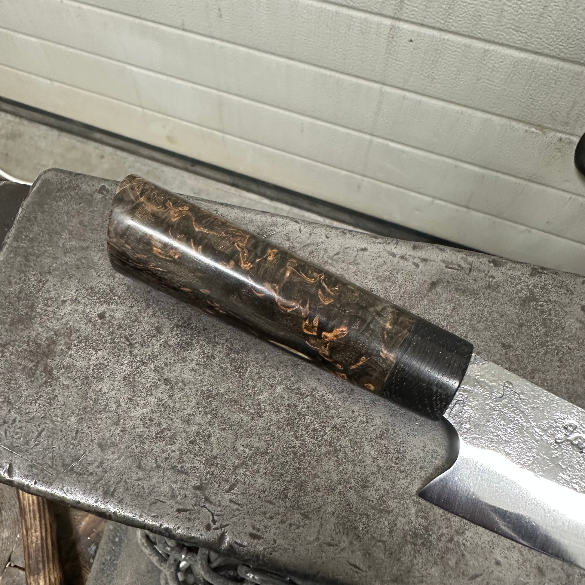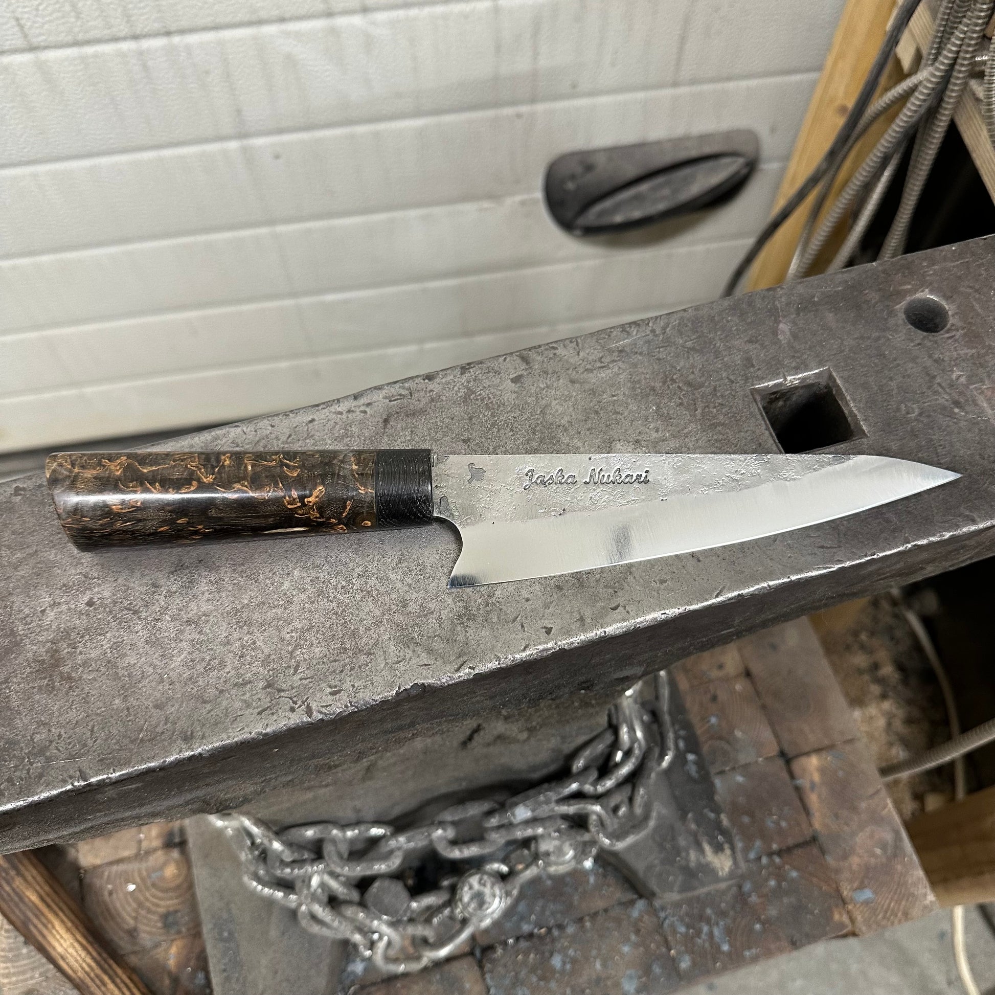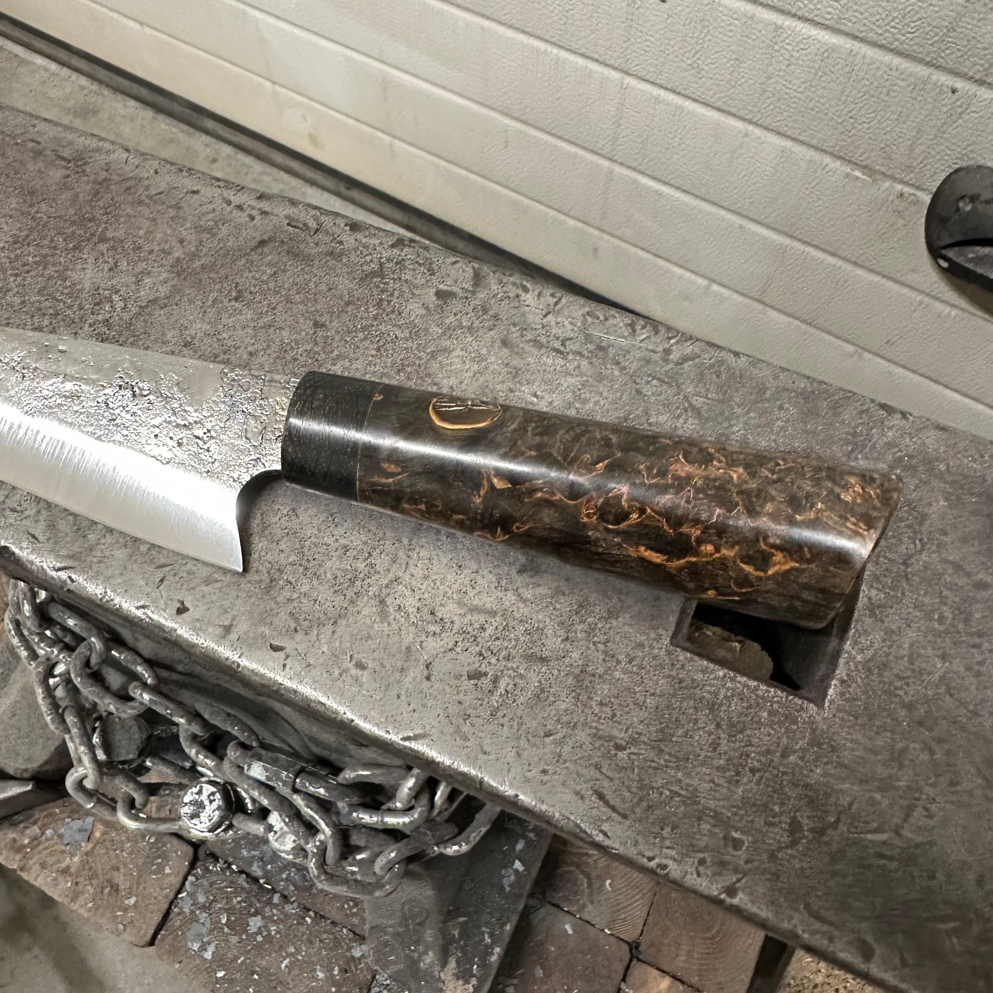 Gyoto käsin tehty kokkiveitsi, rustiikkinen takopintainen 80CrV2 hiiliteräs, noin 170x40mm terällä. Kahva stabilisoitua visakoivua ja päädyssä noin 5000 vuotta vanhaa suotammea.