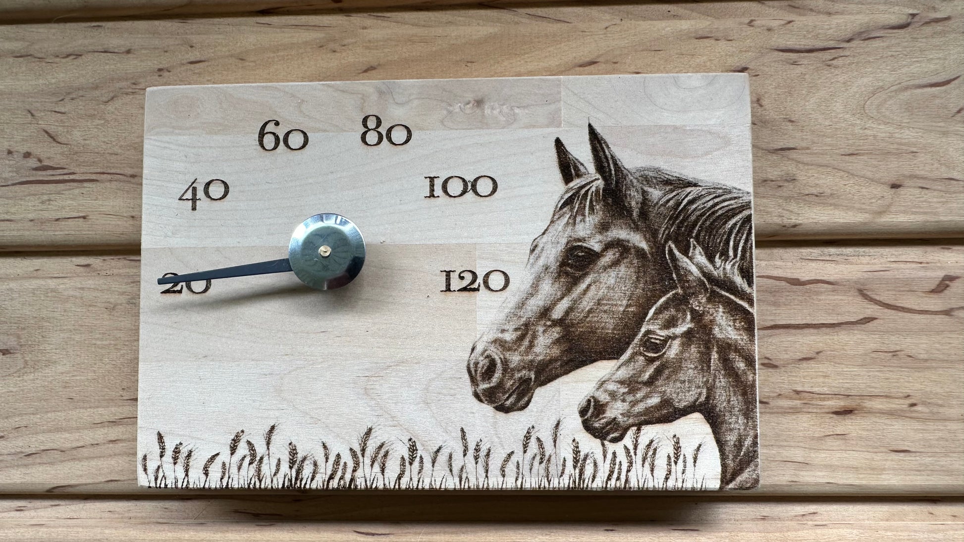 Saunamittari koko 180x120mm koivua. Kuvat on tehty saunamittariin laser kaiverruksena.