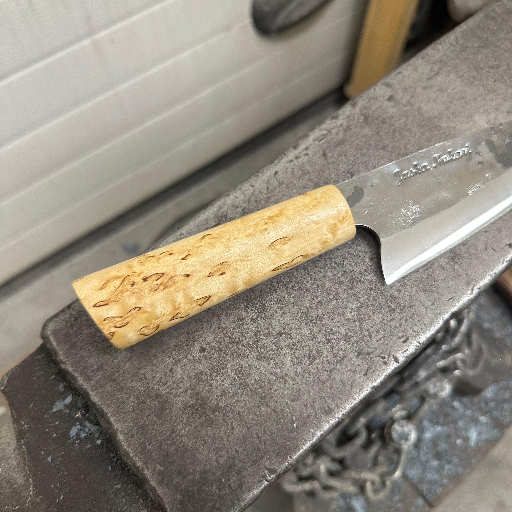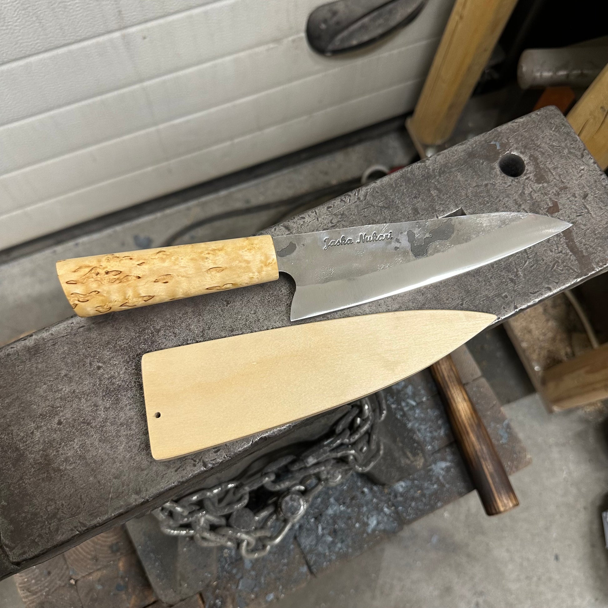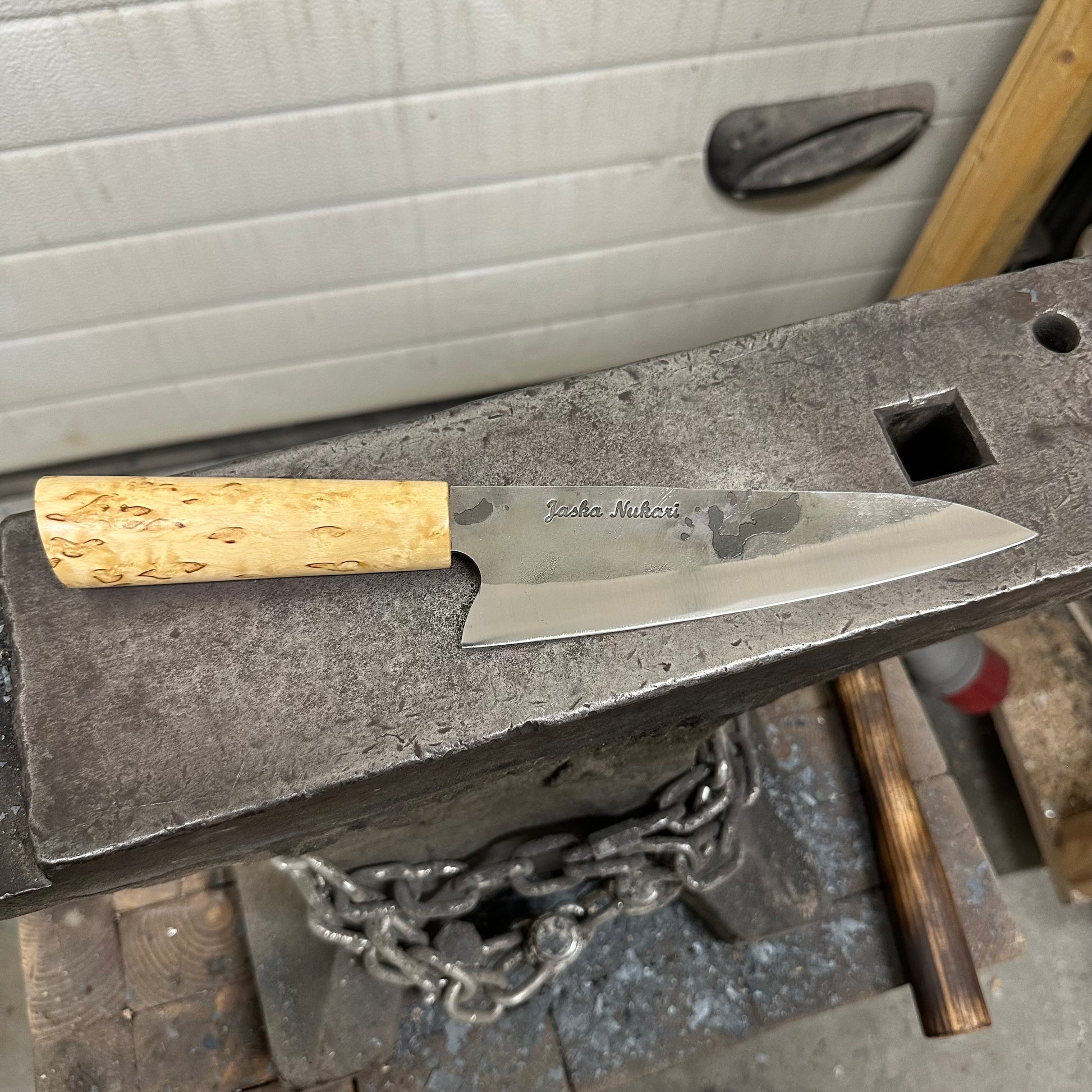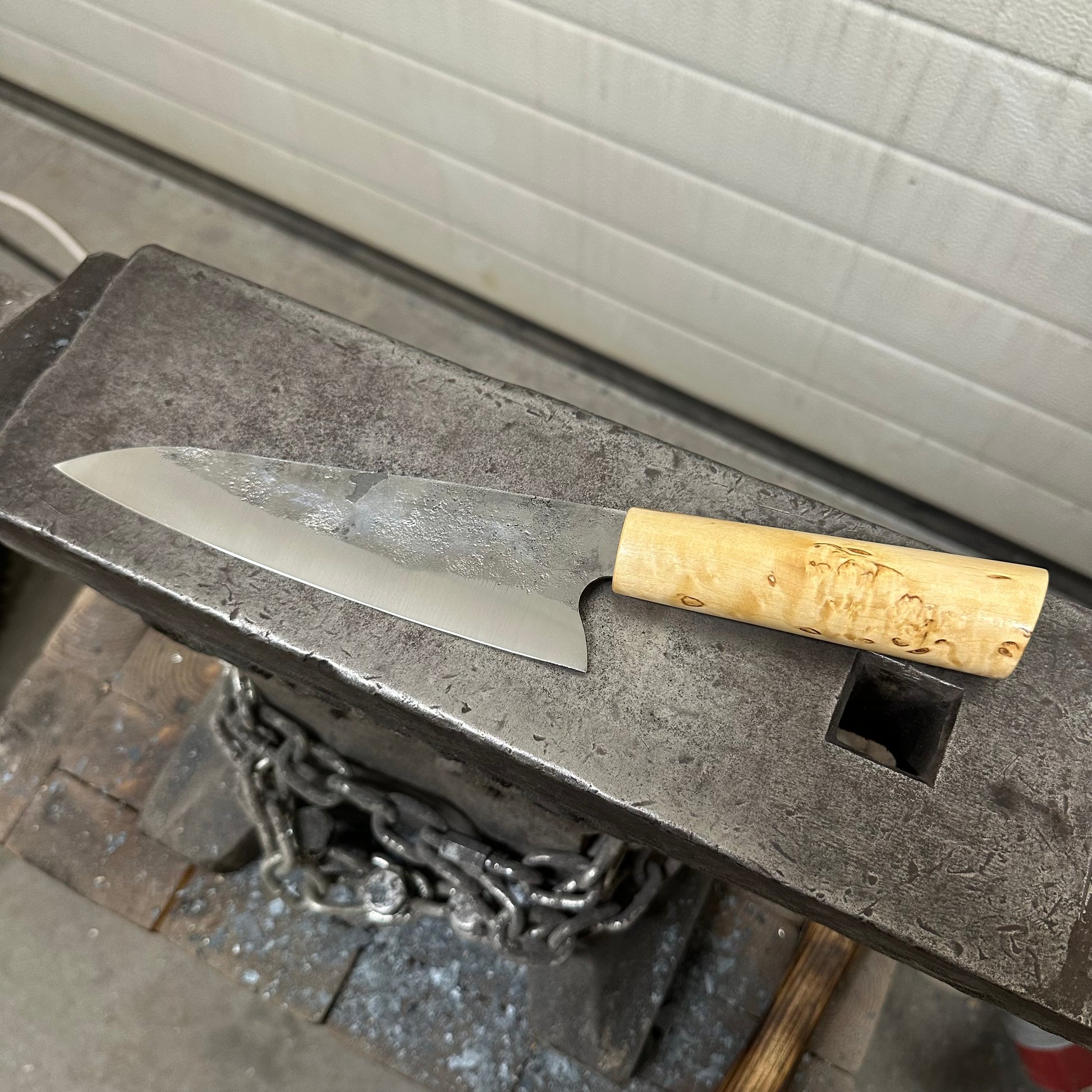 Gyoto käsin tehty kokkiveitsi, rustiikkinen takopintainen 80CrV2 hiiliteräs, noin 180x50mm terällä. Kahva visakoivua.