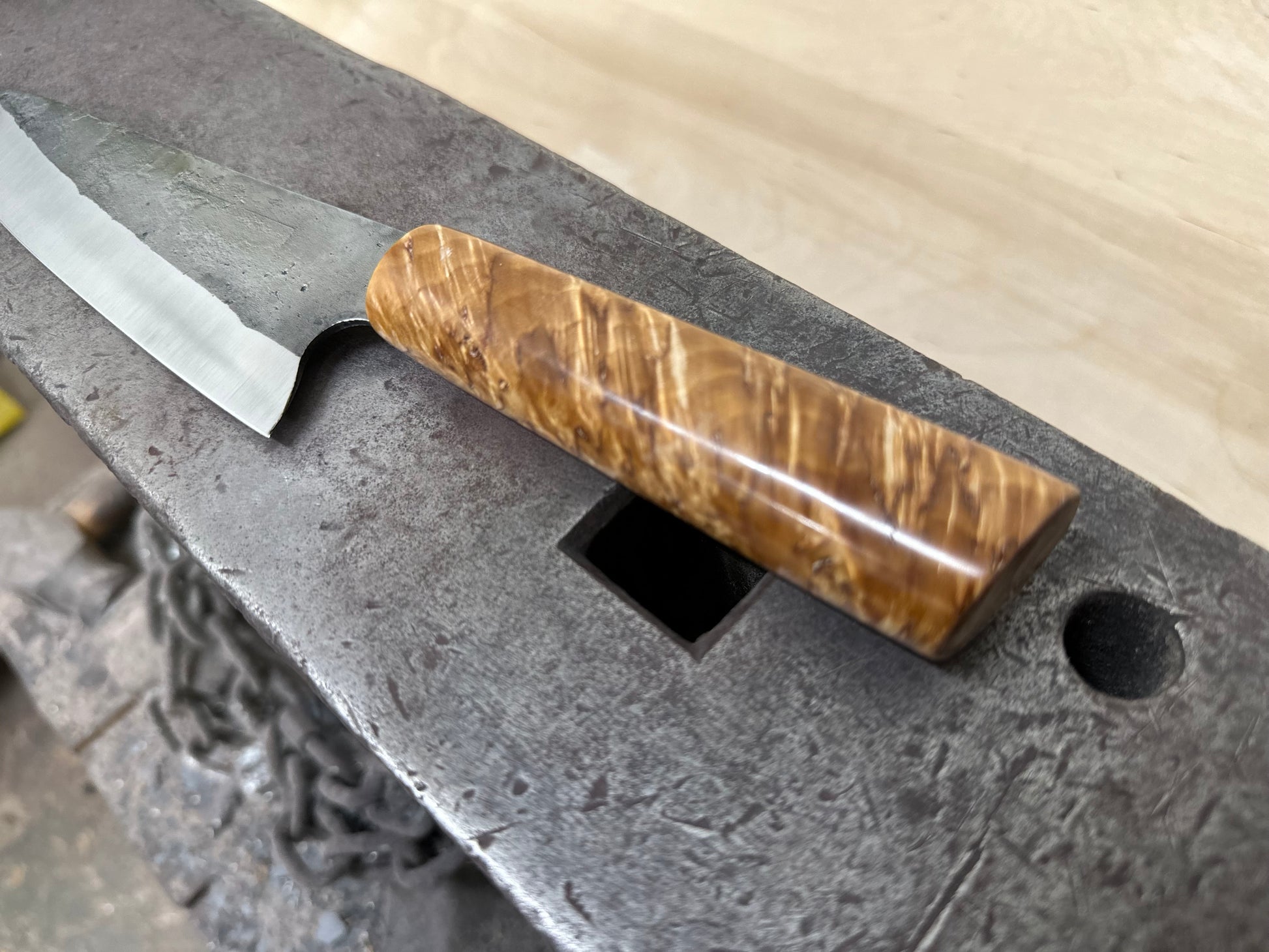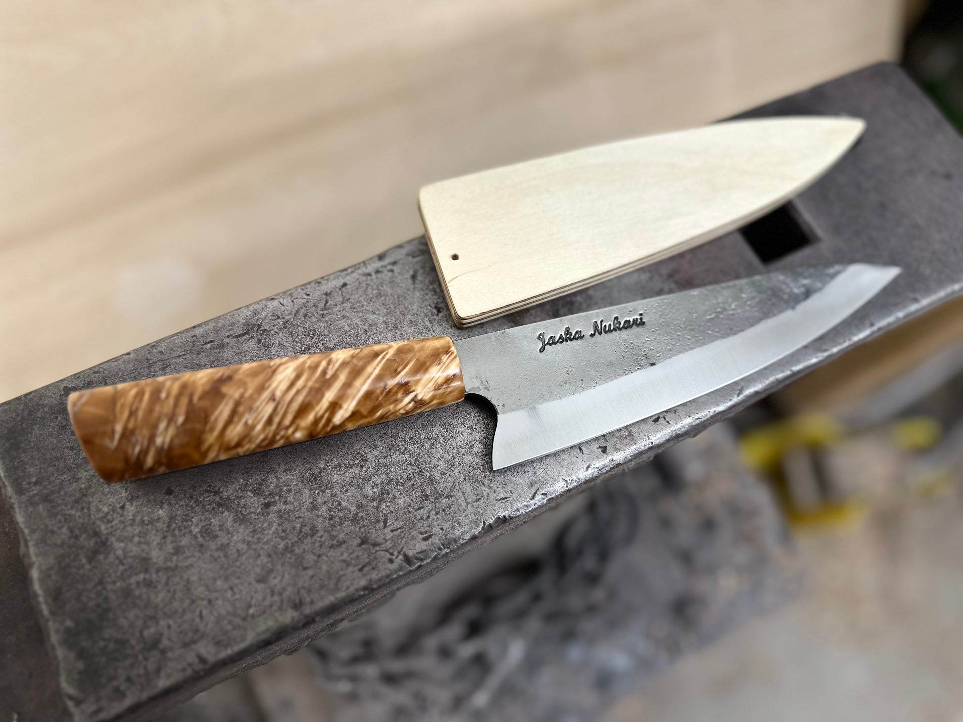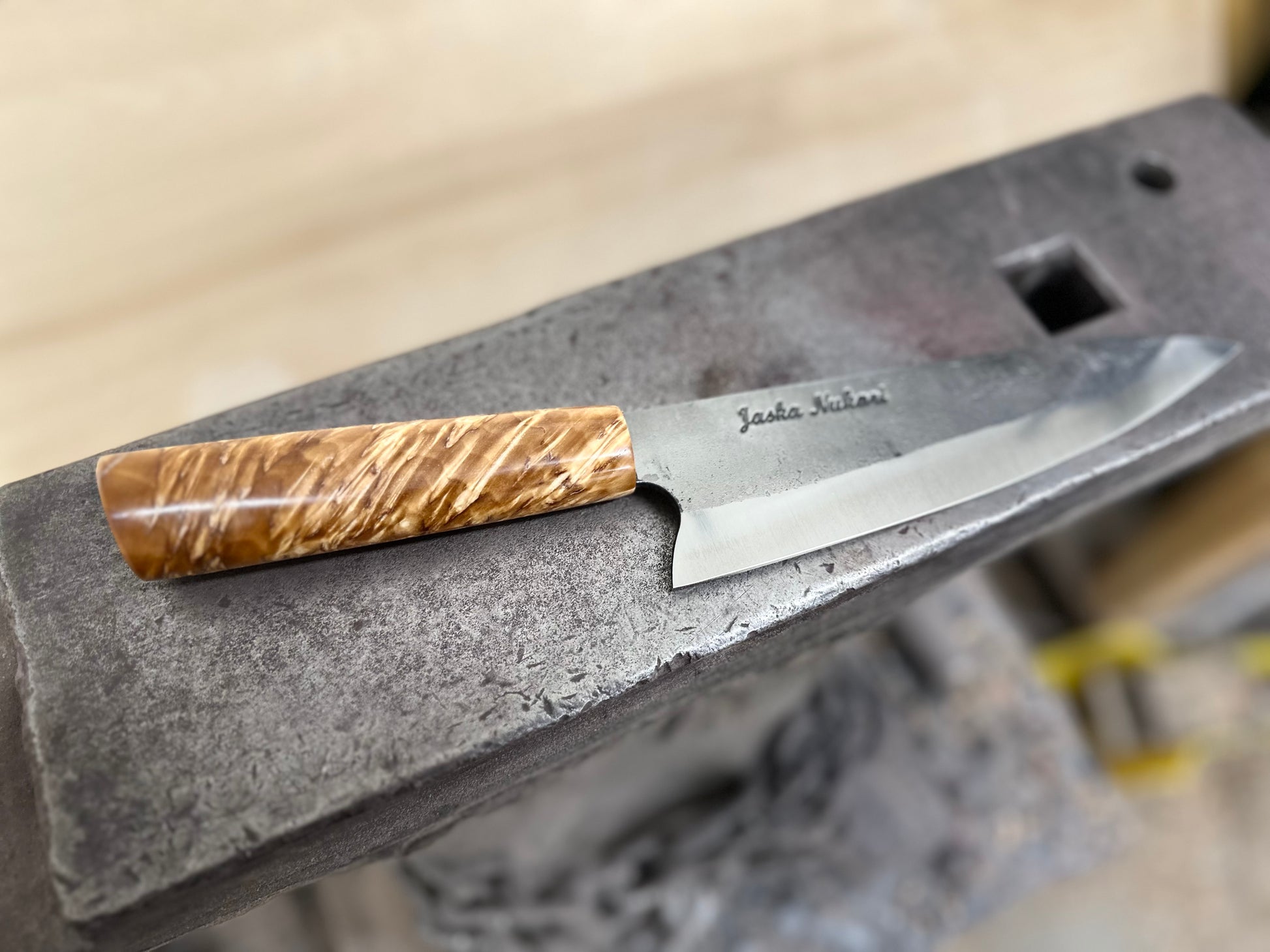Gyoto käsin tehty kokkiveitsi, rustiikkinen takopintainen 80CrV2 hiiliteräs, noin 180x50mm terällä. Kahva stabilisoitua x-cut visakoivua.