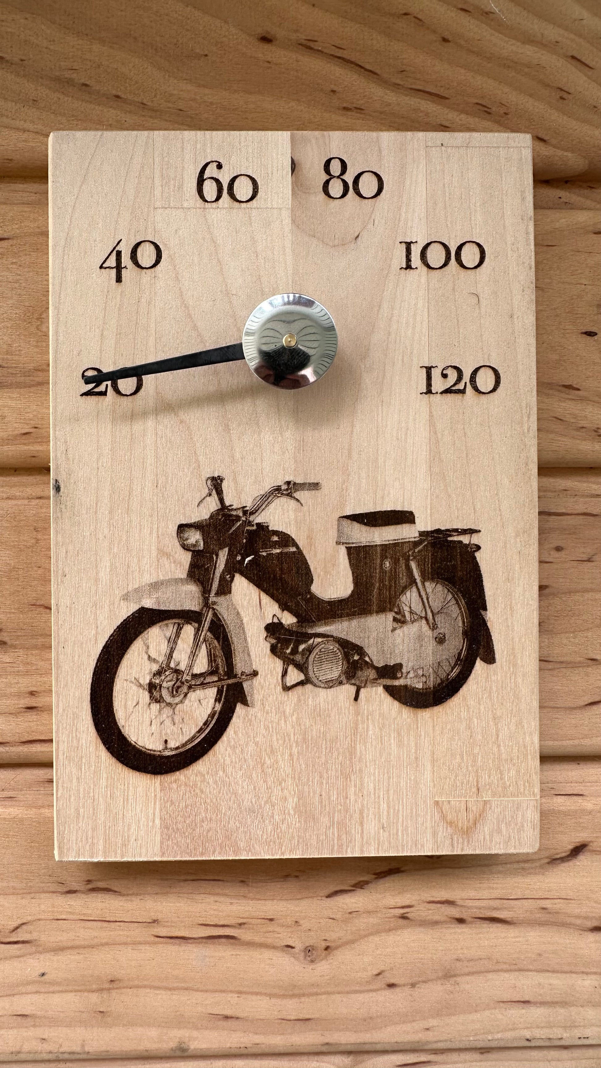 Saunamittari koko 120x180mm koivua. Kuvat on tehty saunamittariin laser kaiverruksena.