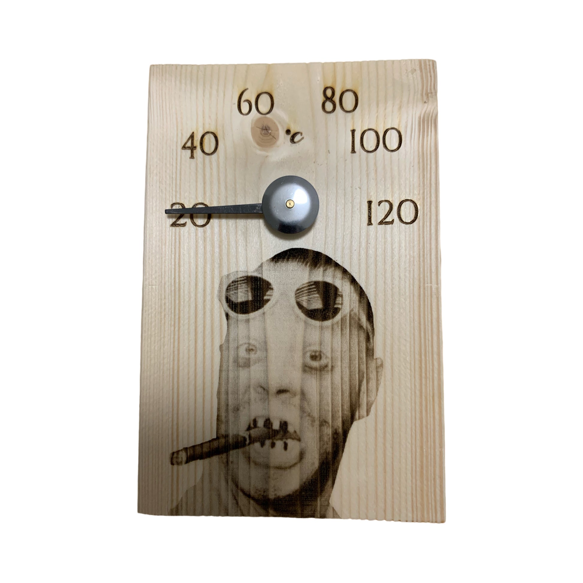 Saunamittari koko 120x180mm. Kuvat on tehty saunamittariin laser kaiverruksena.