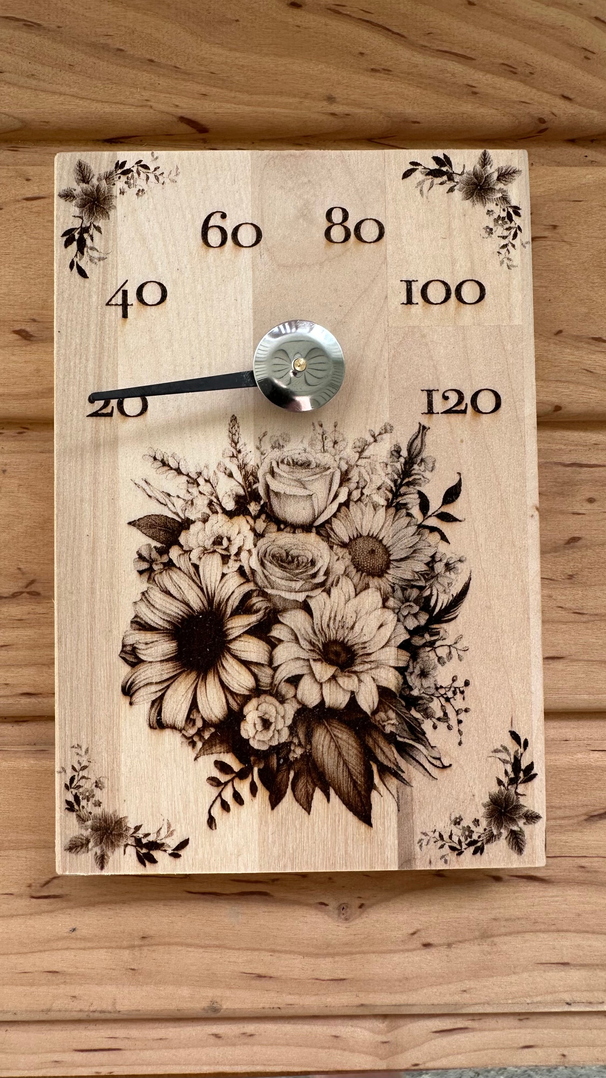 Saunamittari koko 180x120mm koivua. Kuvat on tehty saunamittariin laser kaiverruksena.