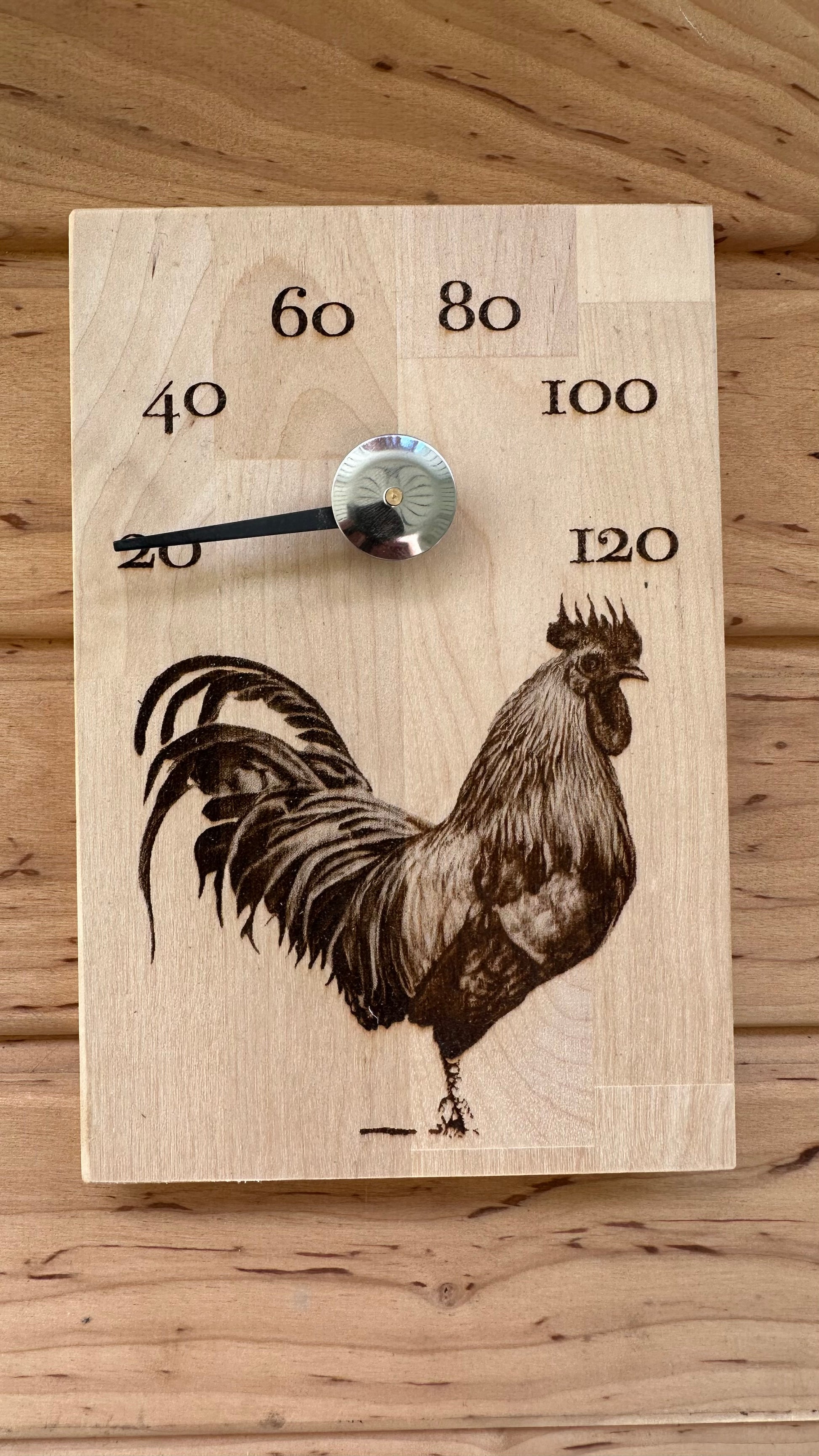 Saunamittari koko 180x120mm koivua. Kuvat on tehty saunamittariin laser kaiverruksena.