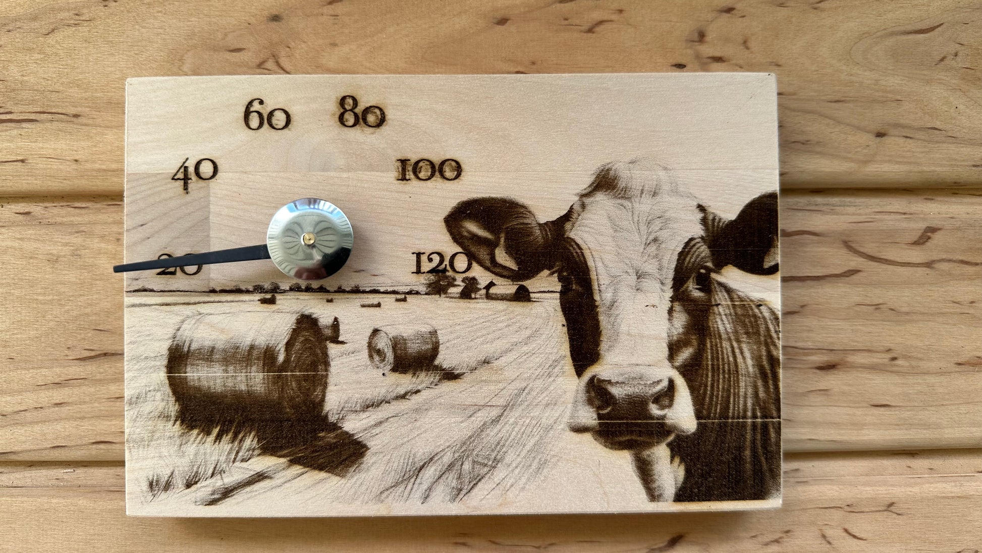Saunamittari koko 180x120mm. Kuvat on tehty saunamittariin laser kaiverruksena.