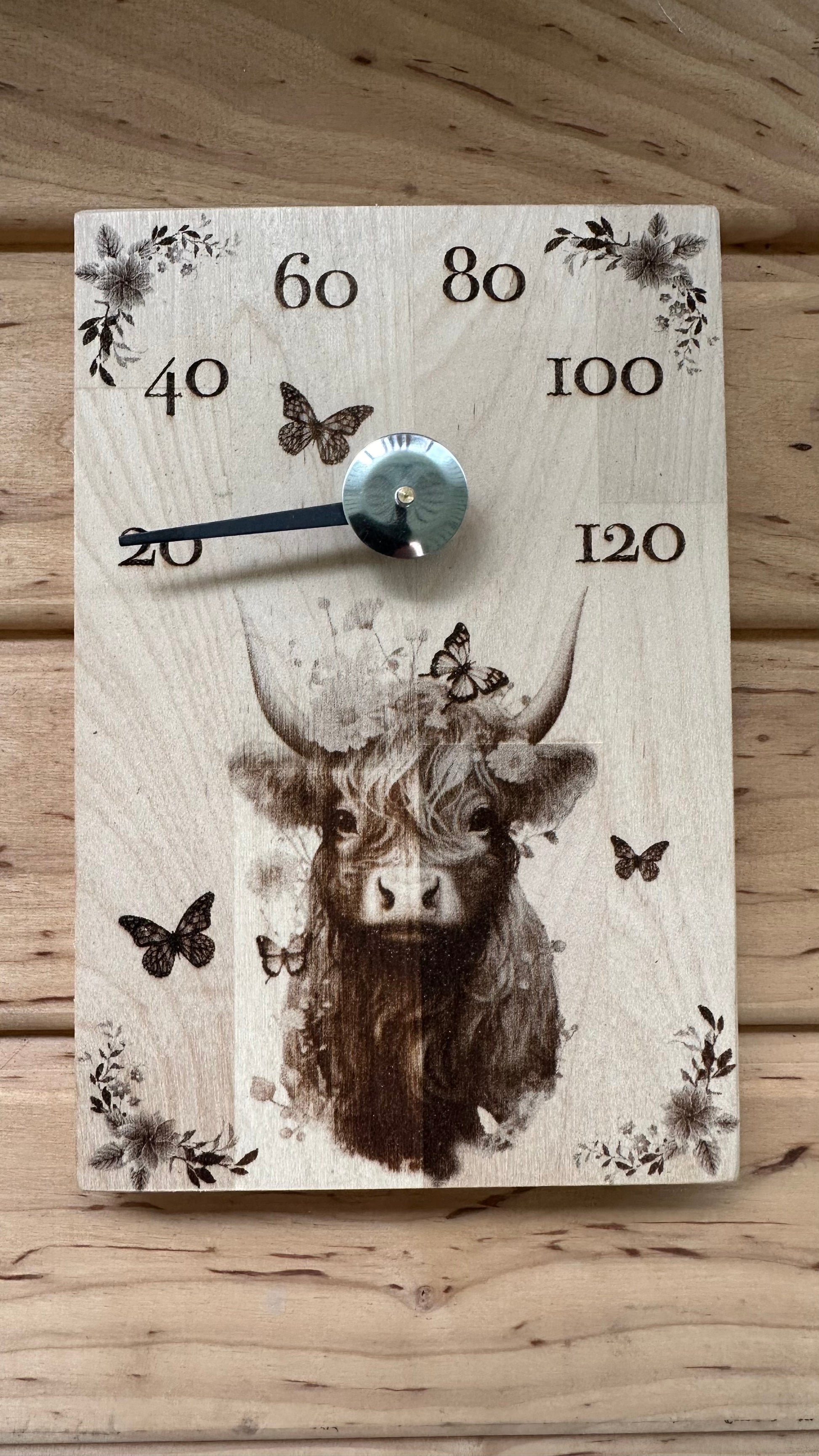Saunamittari koko 180x120mm koivua. Kuvat on tehty saunamittariin laser kaiverruksena.
