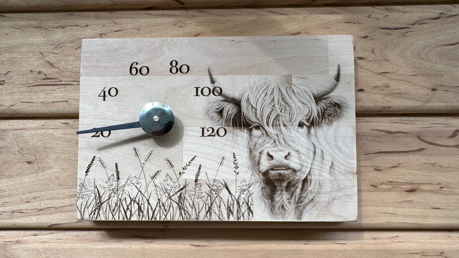 Saunamittari koko 180x120mm koivua. Kuvat on tehty saunamittariin laser kaiverruksena.