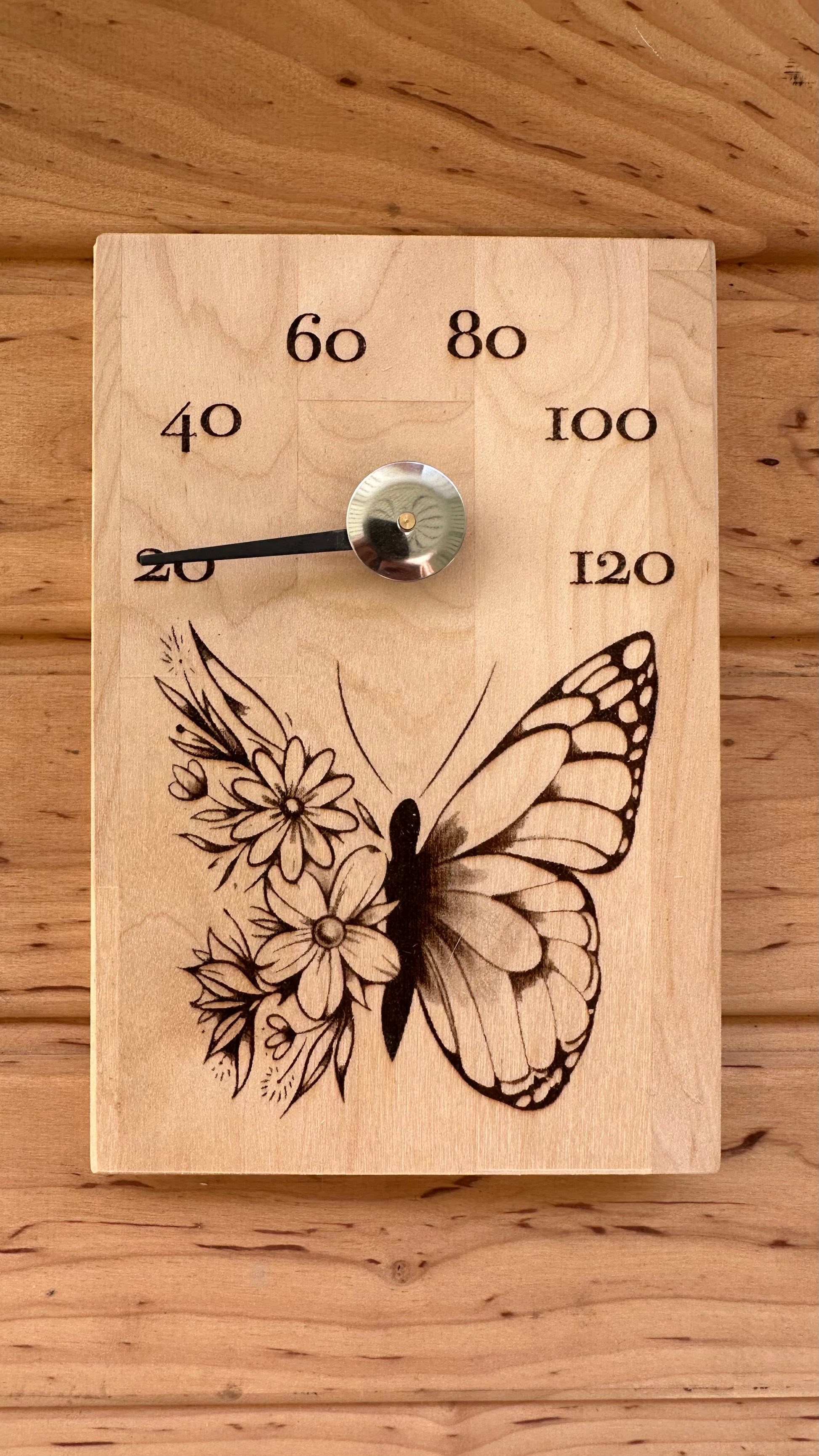Saunamittari koko 180x120mm koivua. Kuvat on tehty saunamittariin laser kaiverruksena.