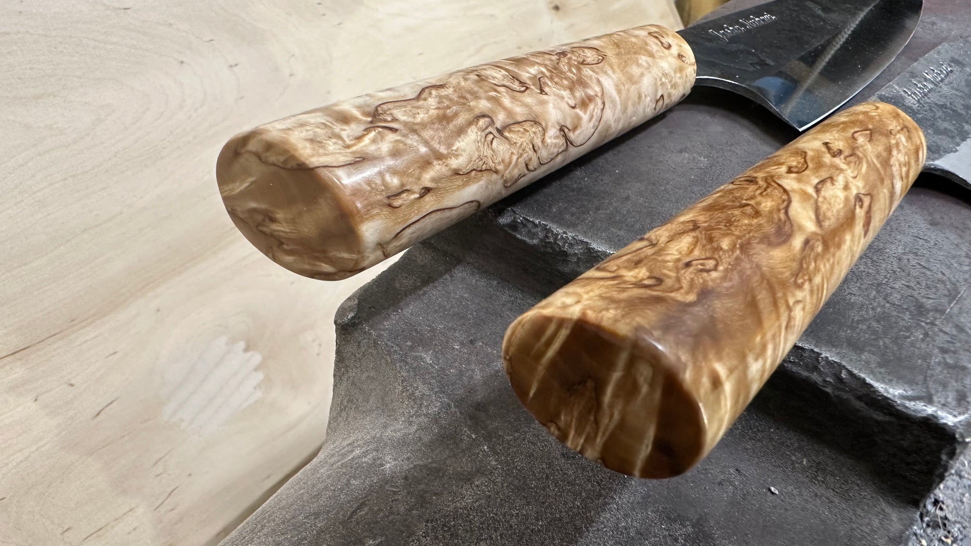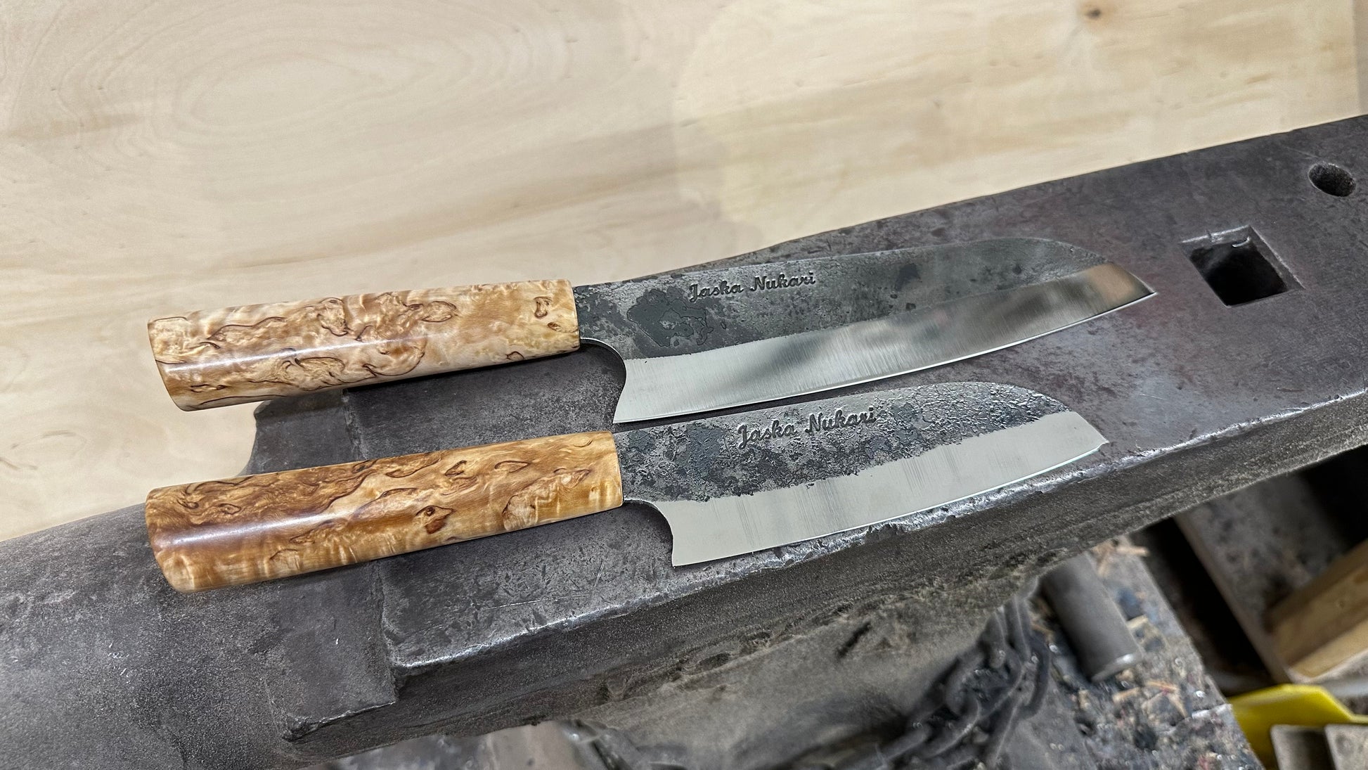 Santoku käsin tehdyt kokkiveitset, rustiikkinen takopintainen 80CrV2 hiiliteräs, noin 185x50mm ja pienempi kasvisveitsi mini santoku noin 130x40mm terällä. Kahvat stabilisoitua visakoivua.