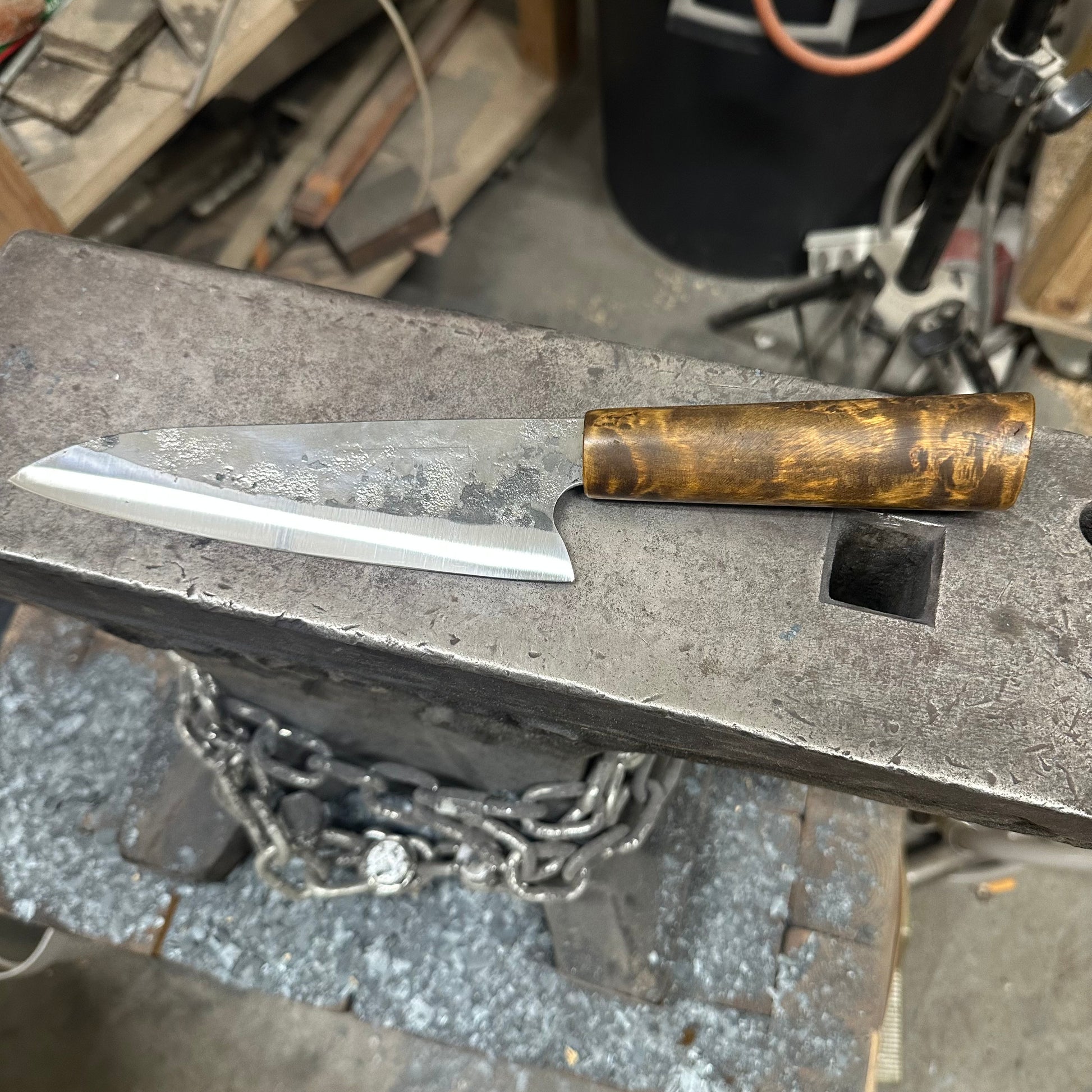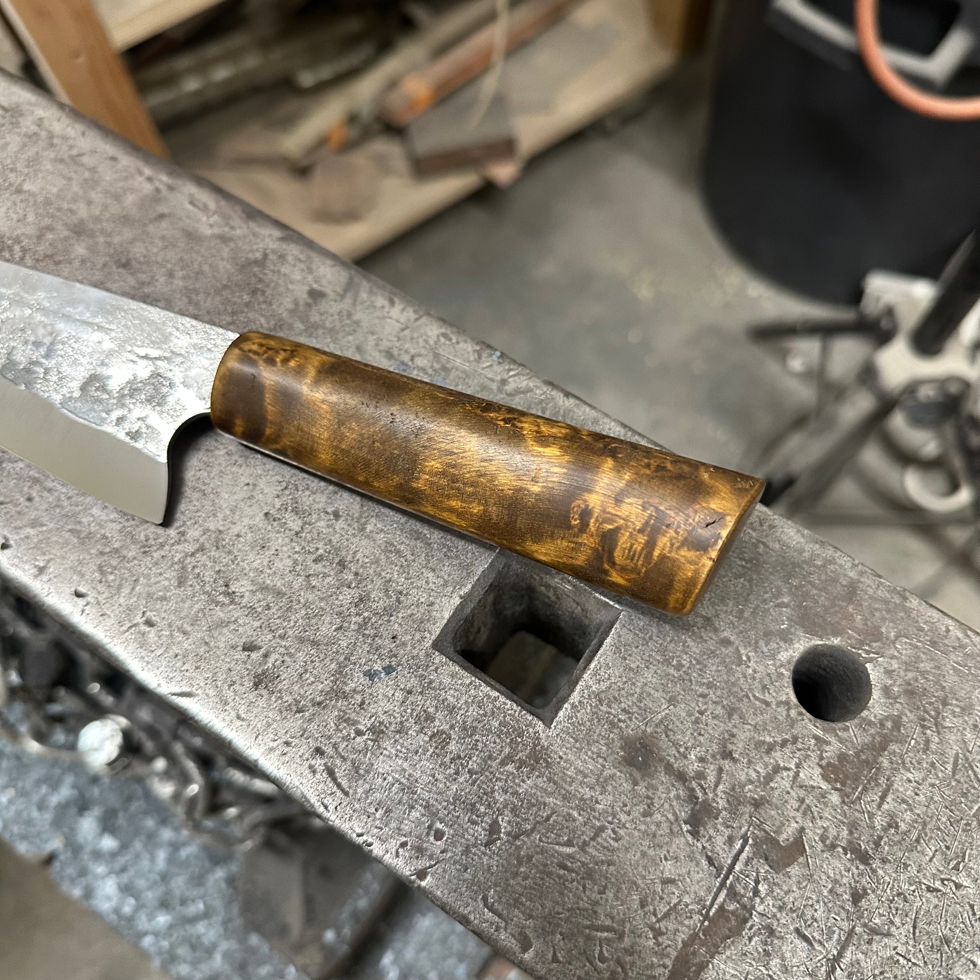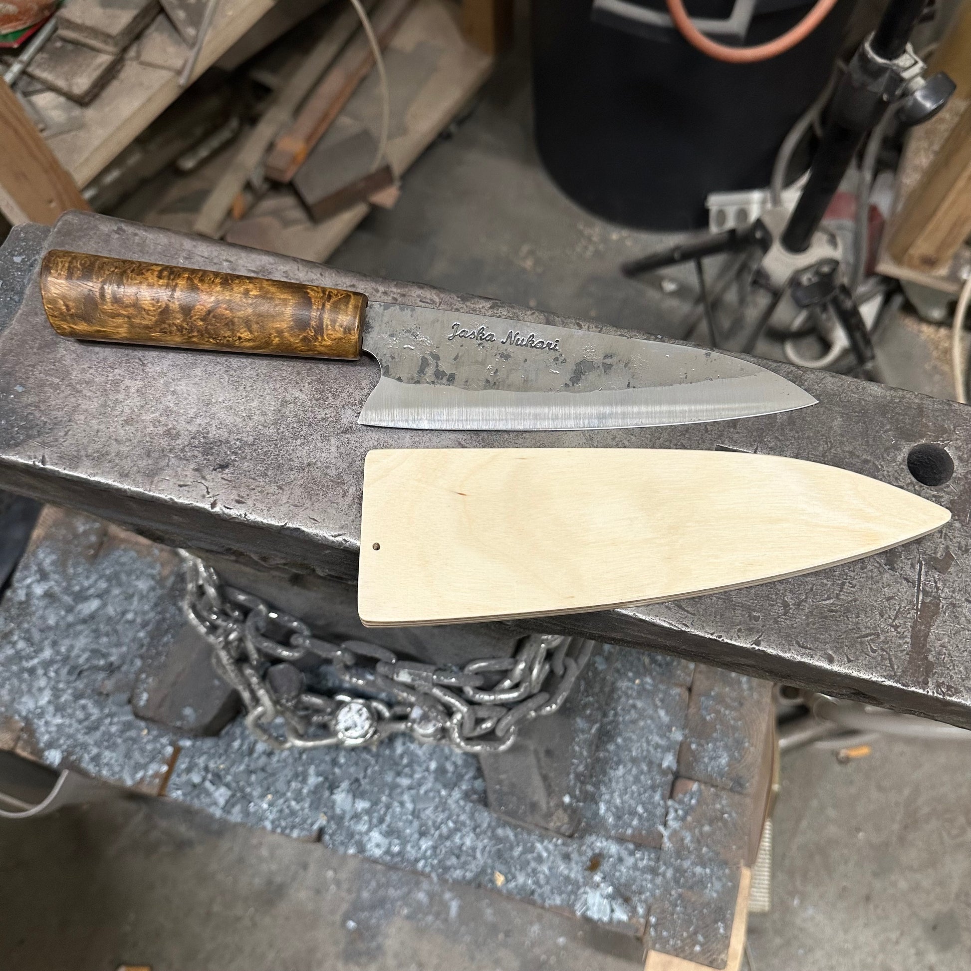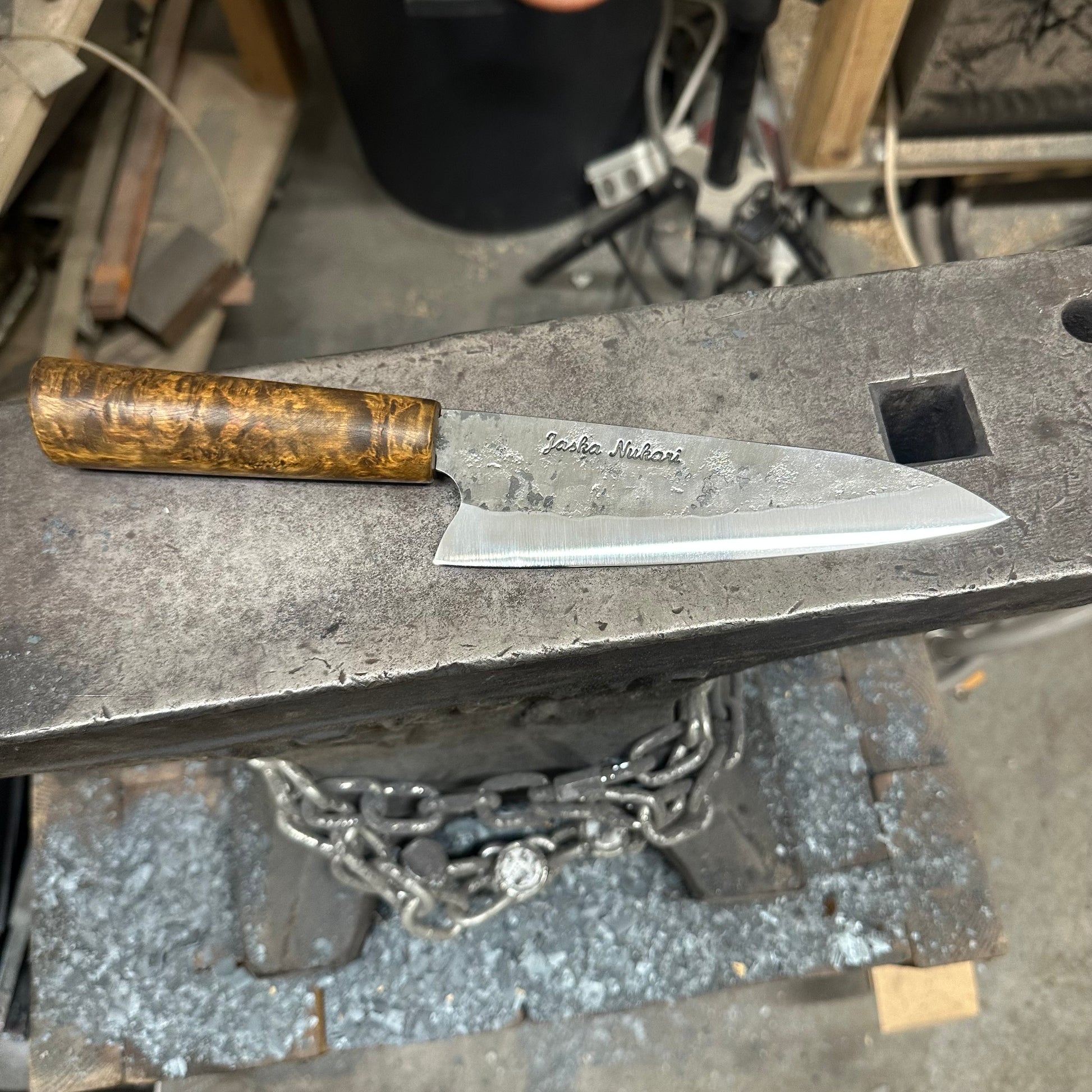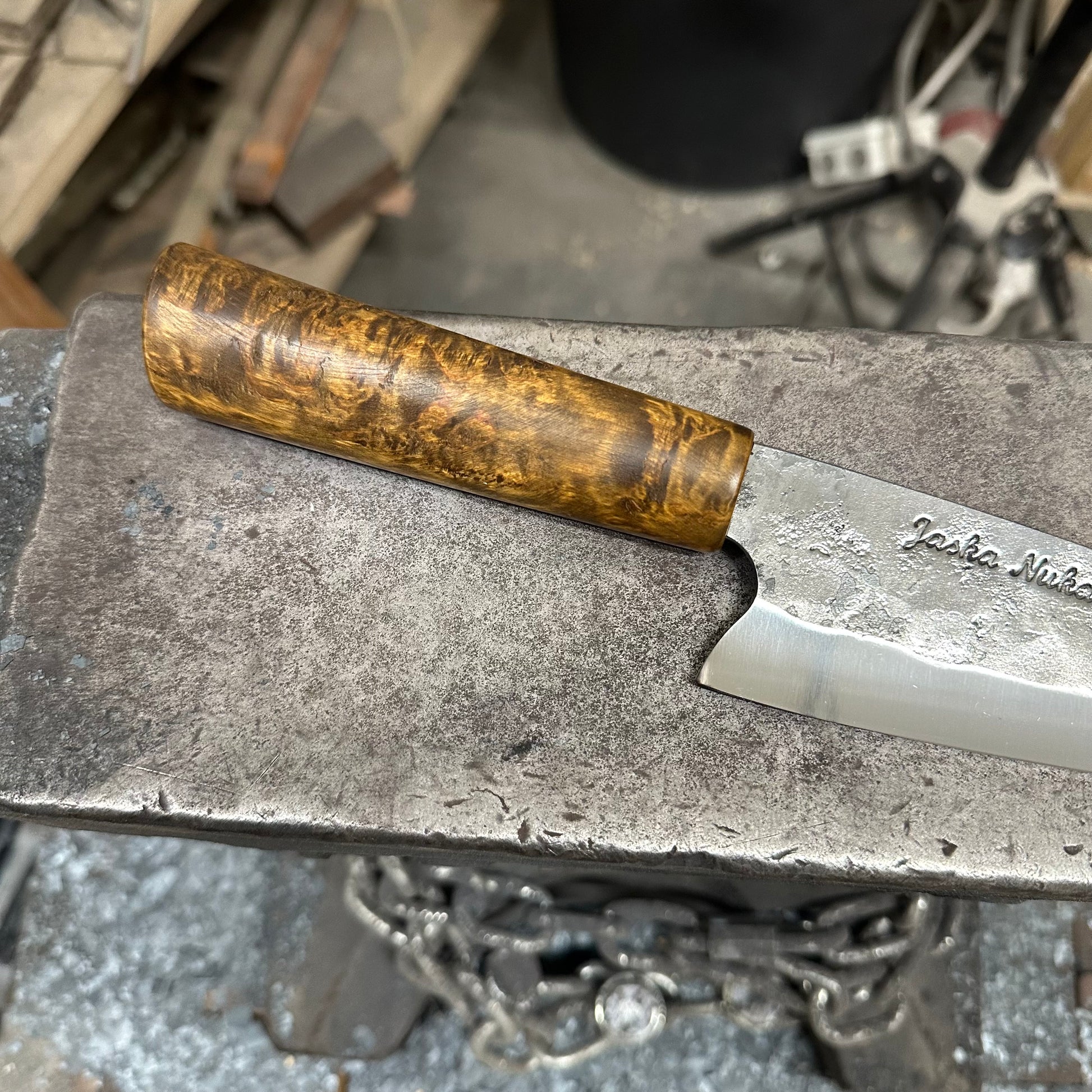 Gyoto käsin tehty kokkiveitsi, rustiikkinen takopintainen 80CrV2 hiiliteräs, noin 180x50mm terällä. Kahva visakoivua.