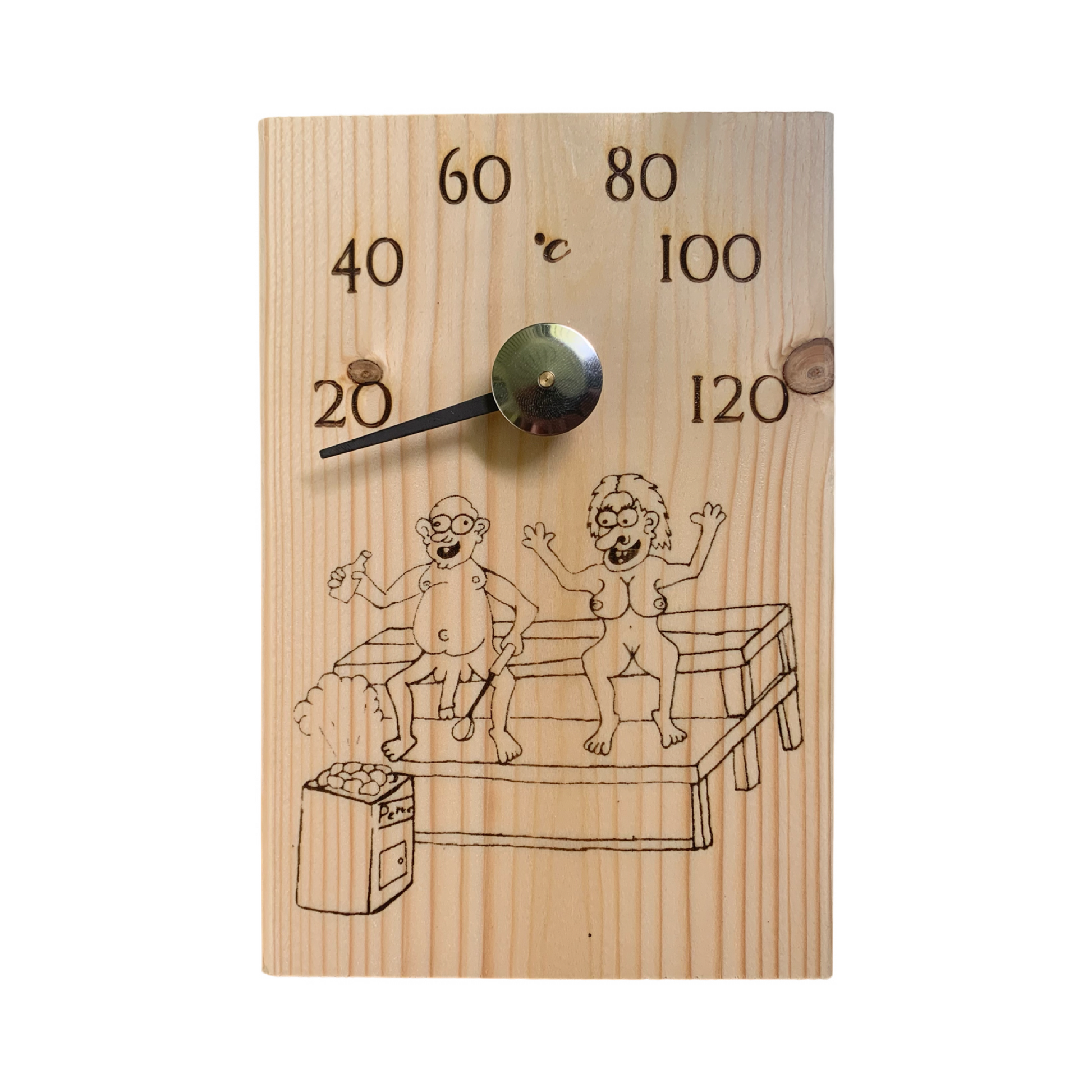 Saunamittari koko 120x180mm. Kuvat on tehty saunamittariin laser kaiverruksena.